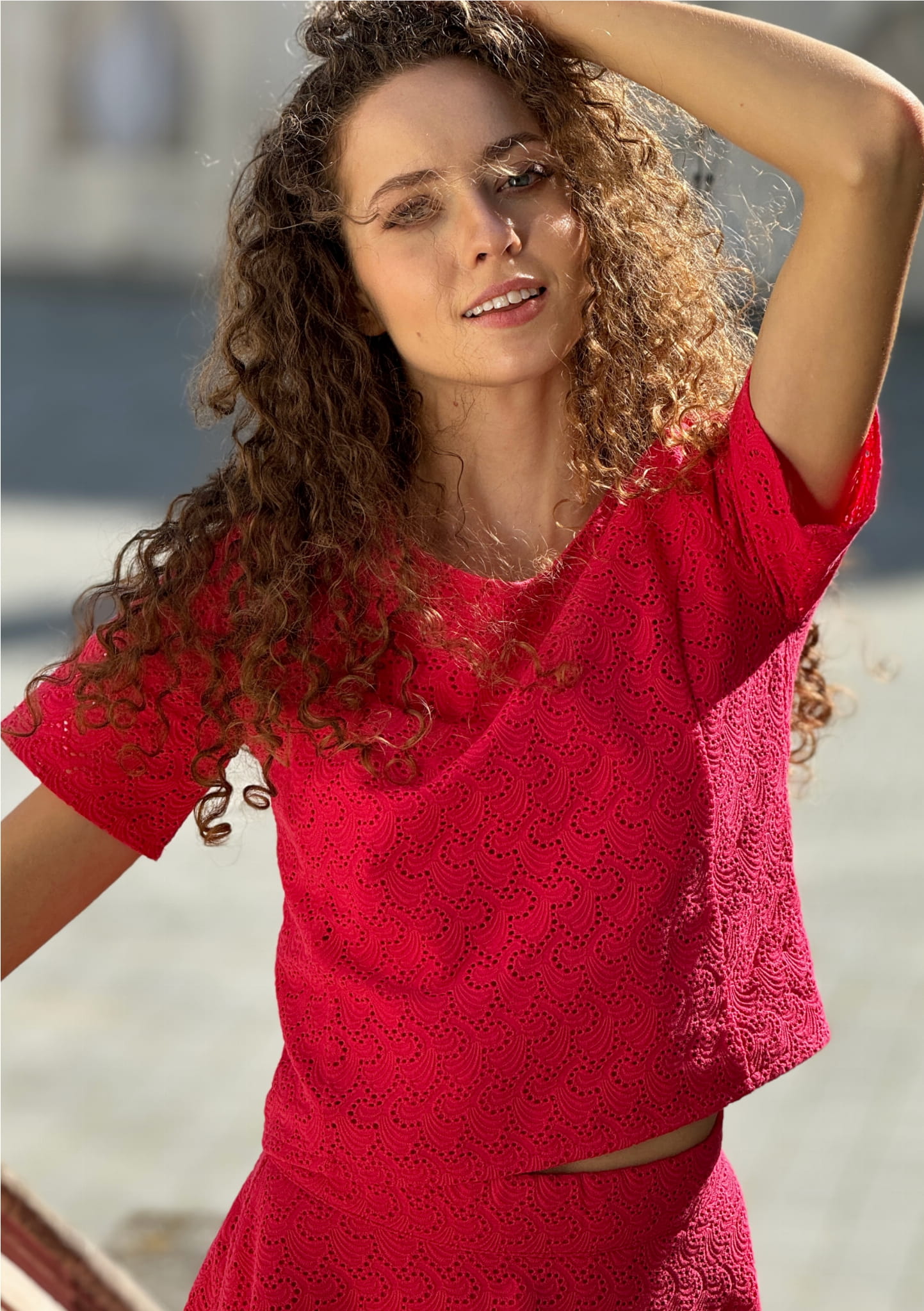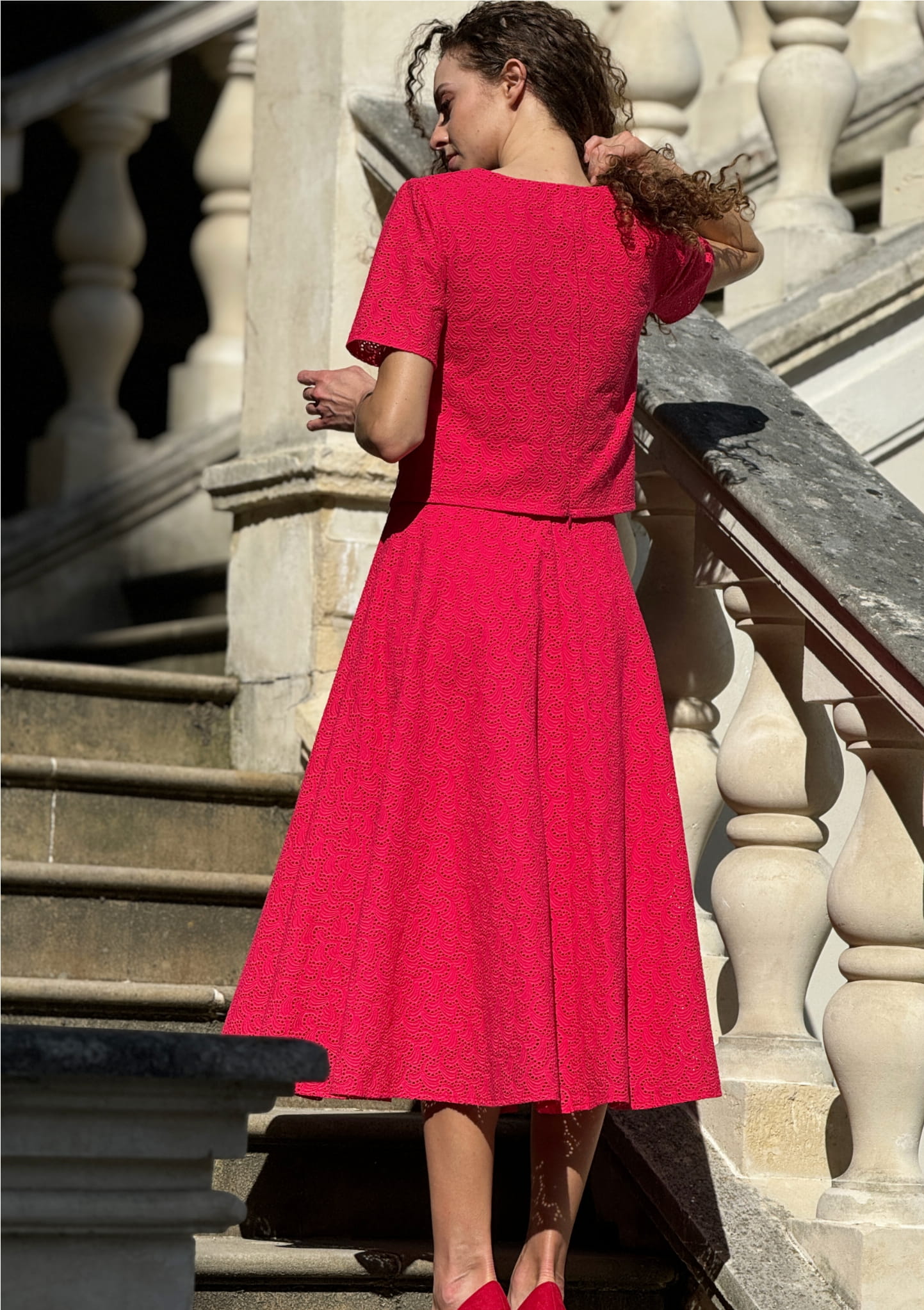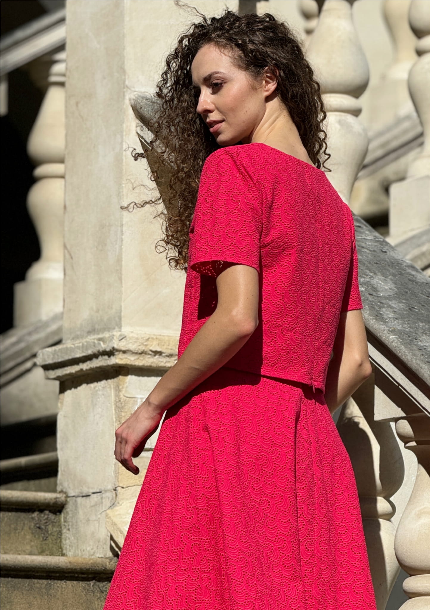 Krótki top z krótkimi rękawami z tkaniny bawełnianej haftowanej z podszewką, z tyłu zamek zapinany od dołu w górę.