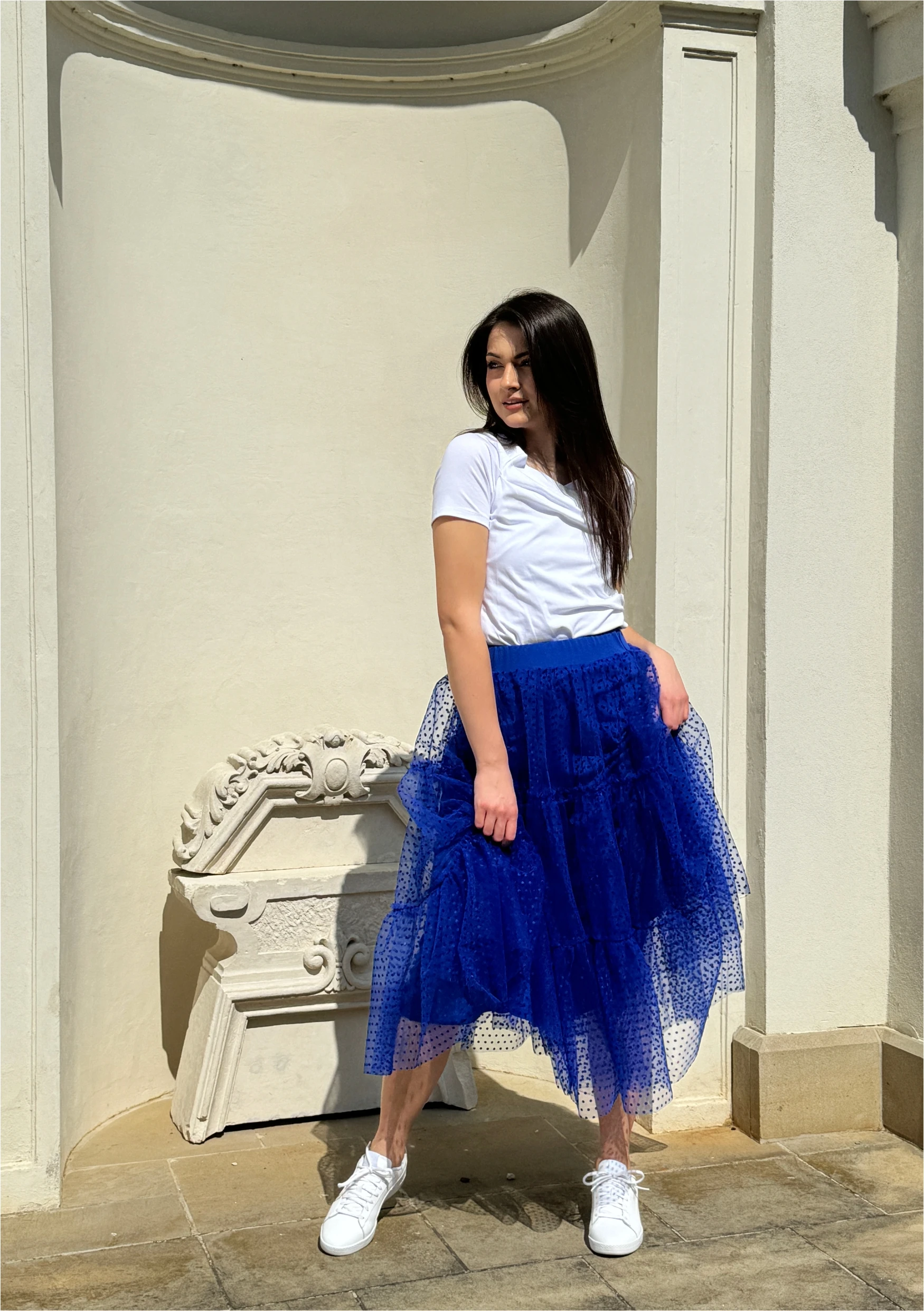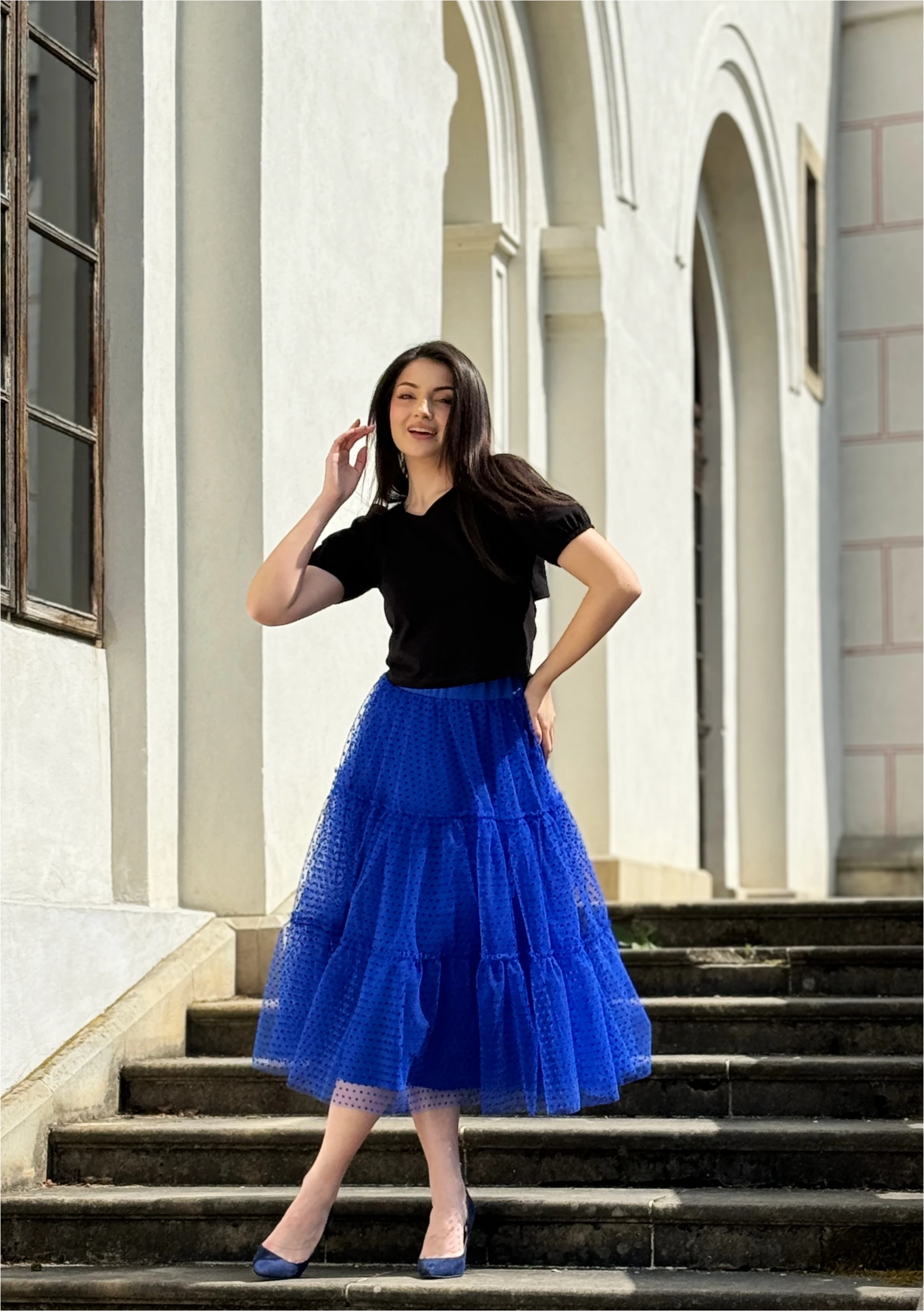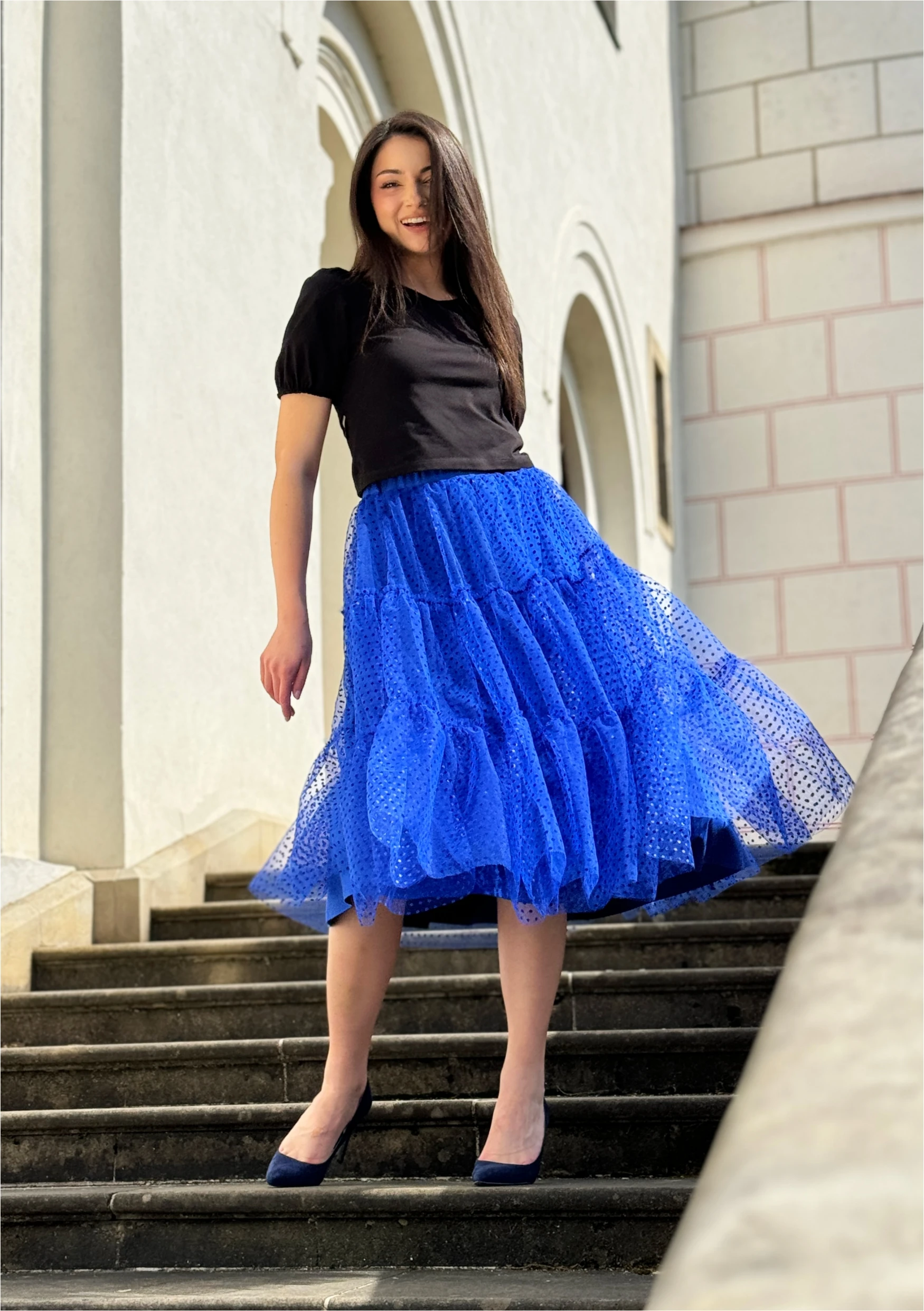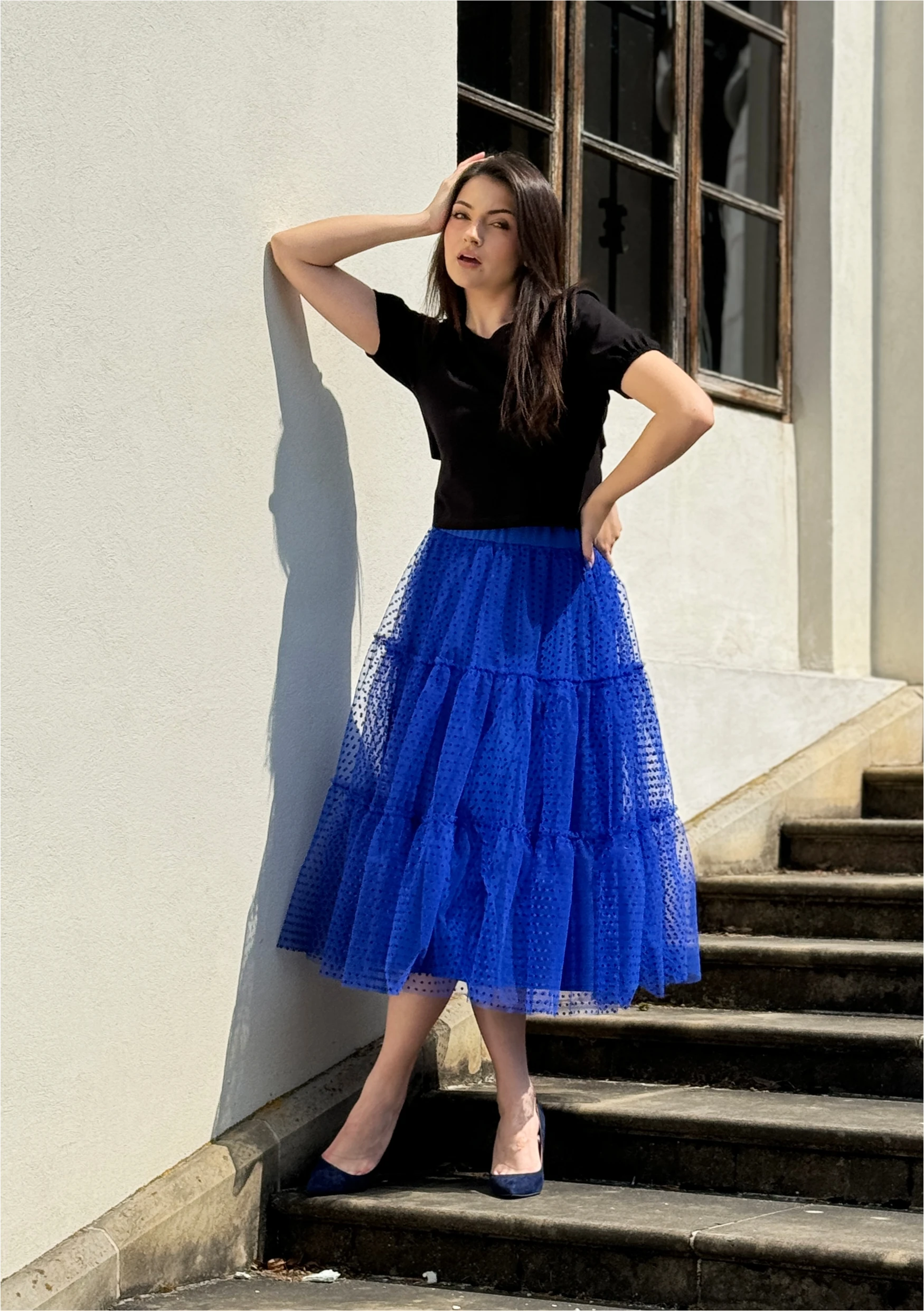 Rozkloszowana spódnica z efektowną wierzchnią warstwą miękkiego tiulu, który tworzy subtelną mgiełkę i dodaje całości elegancji. Spodnia, gładka warstwa zapewnia komfort noszenia, a elastyczny pas gwarantuje idealne dopasowanie i stabilne utrzymanie spódnicy na miejscu. Model idealny na wyjątkowe okazje, jak i do codziennych, bardziej kobiecych stylizacji.