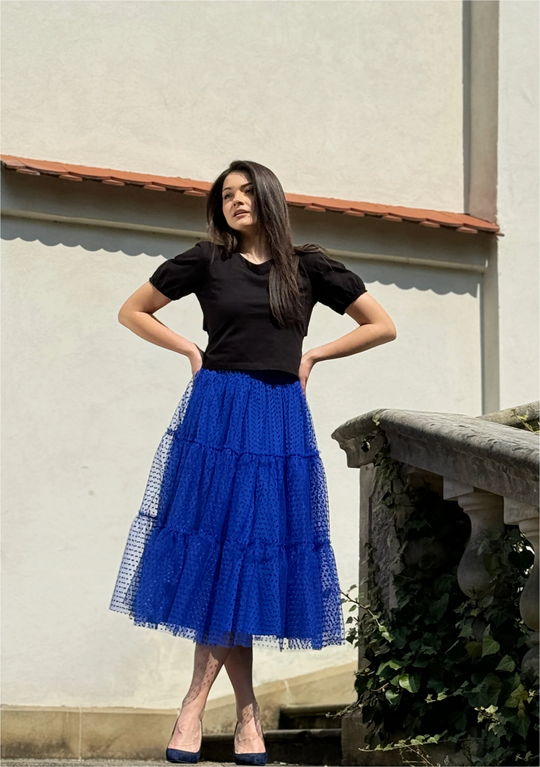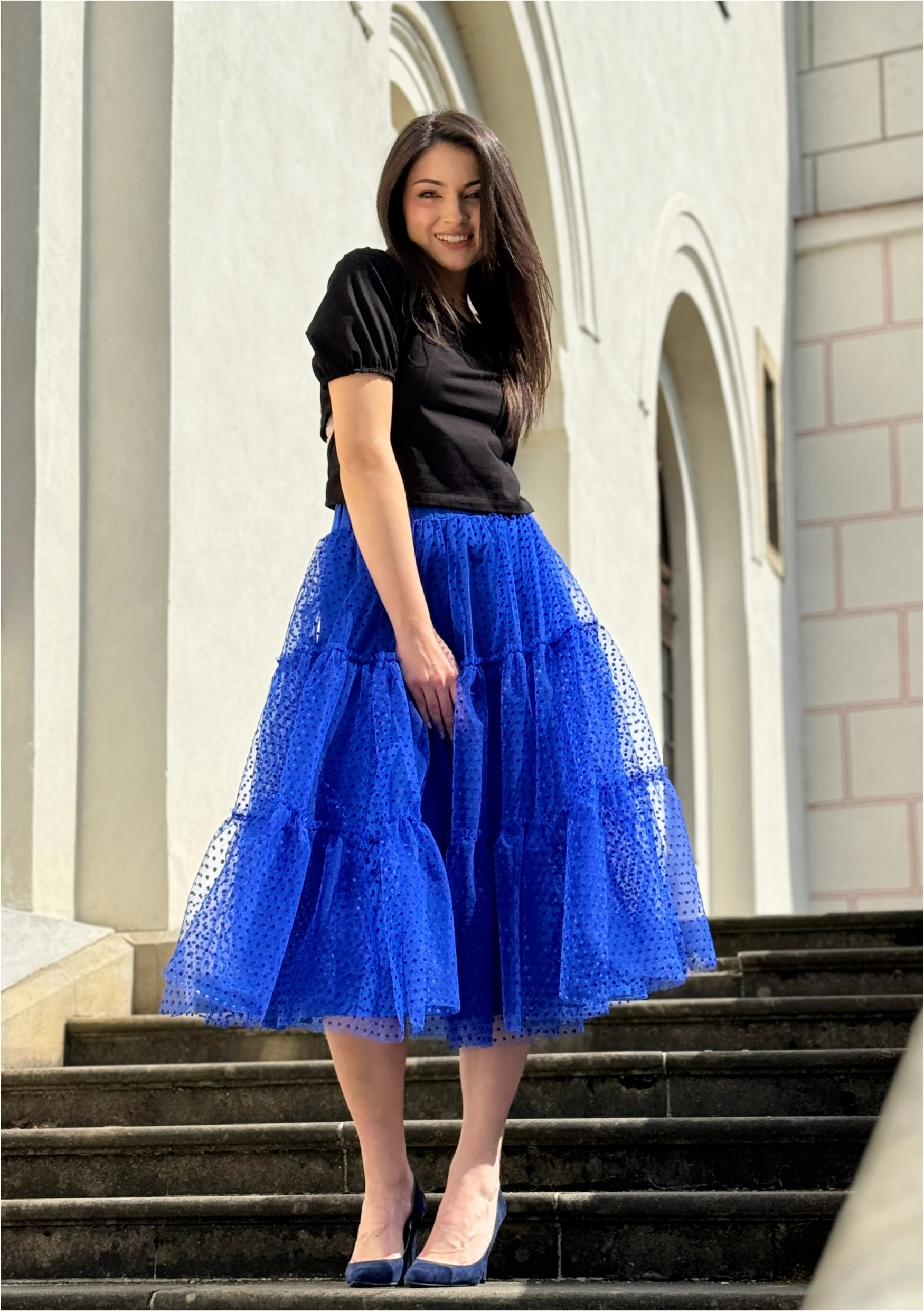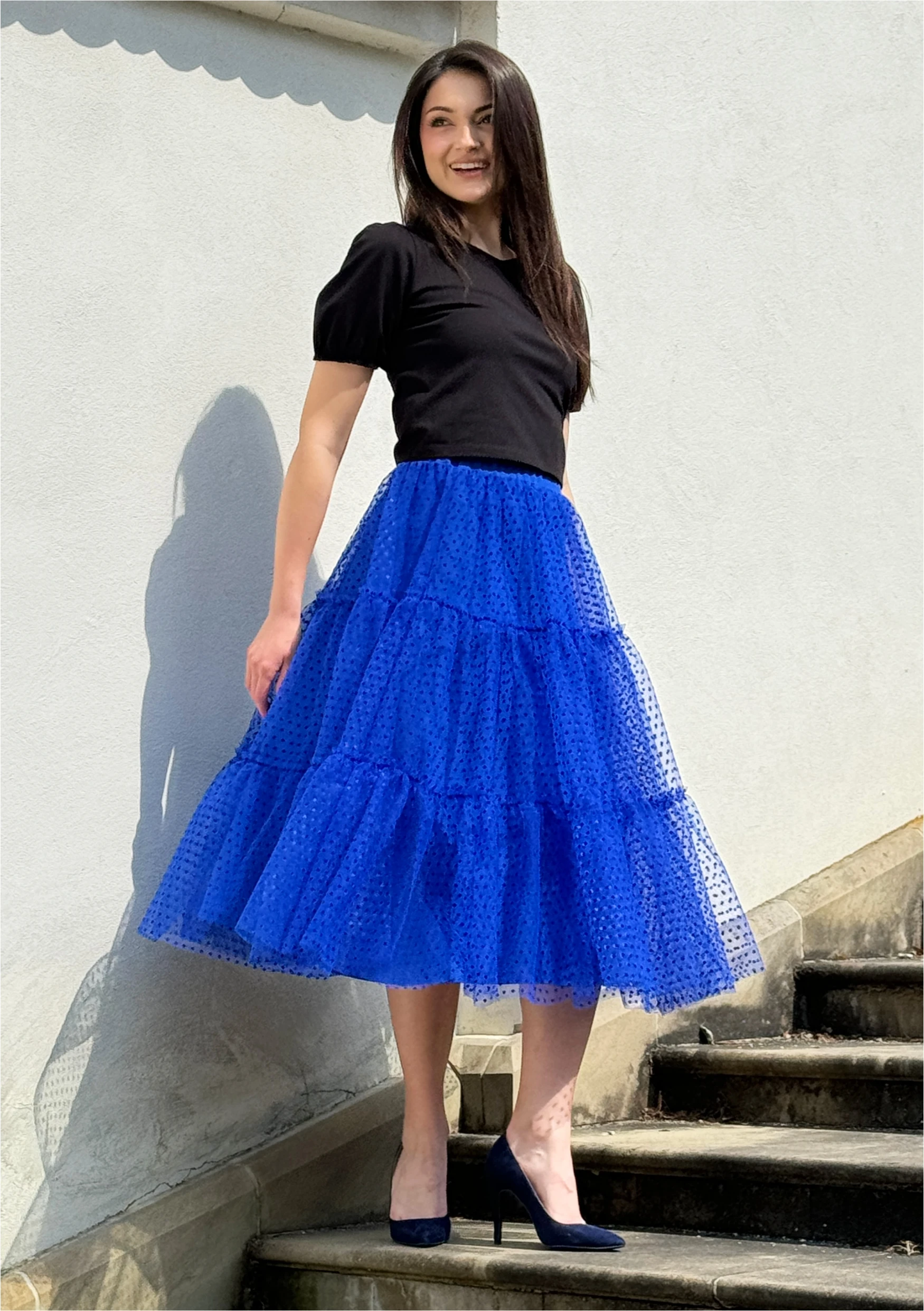 Rozkloszowana spódnica z efektowną wierzchnią warstwą miękkiego tiulu, który tworzy subtelną mgiełkę i dodaje całości elegancji. Spodnia, gładka warstwa zapewnia komfort noszenia, a elastyczny pas gwarantuje idealne dopasowanie i stabilne utrzymanie spódnicy na miejscu. Model idealny na wyjątkowe okazje, jak i do codziennych, bardziej kobiecych stylizacji.