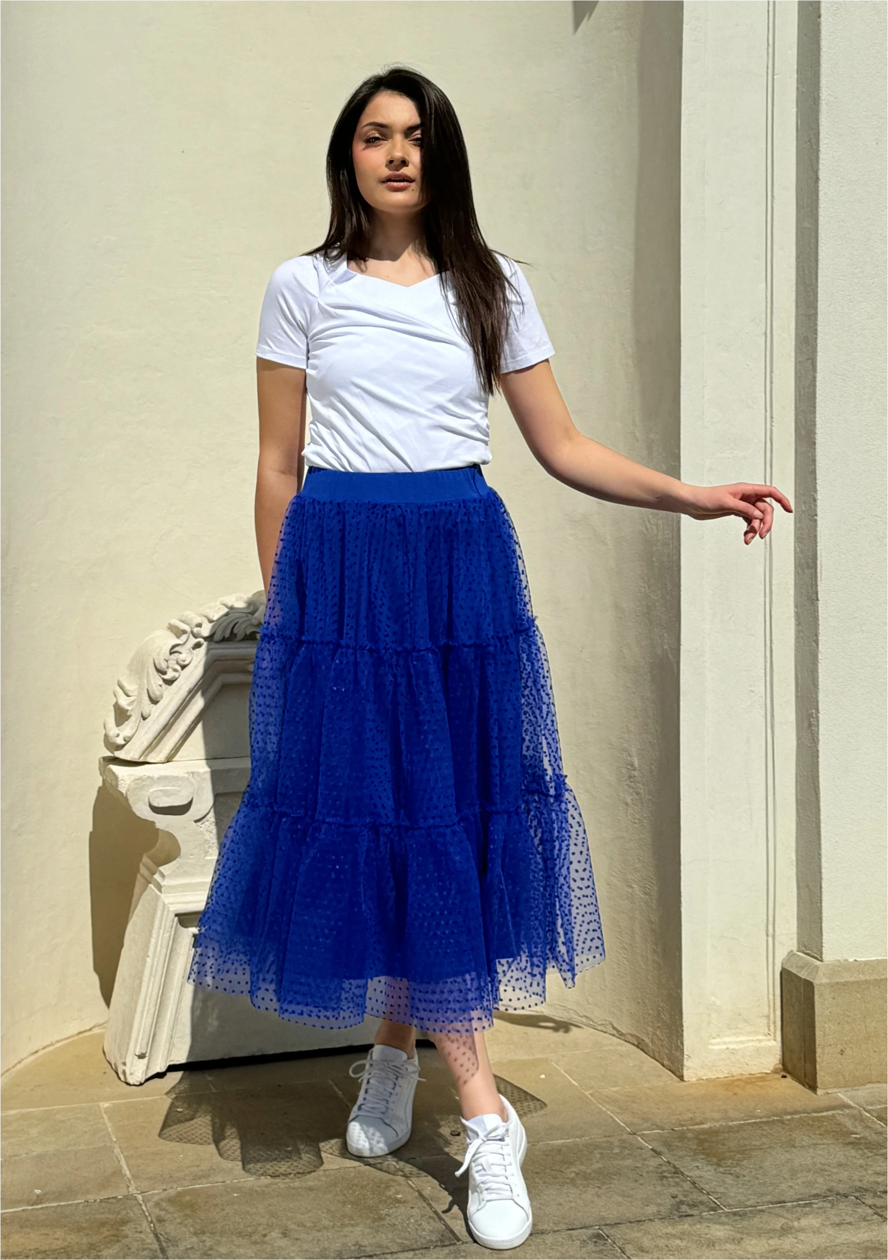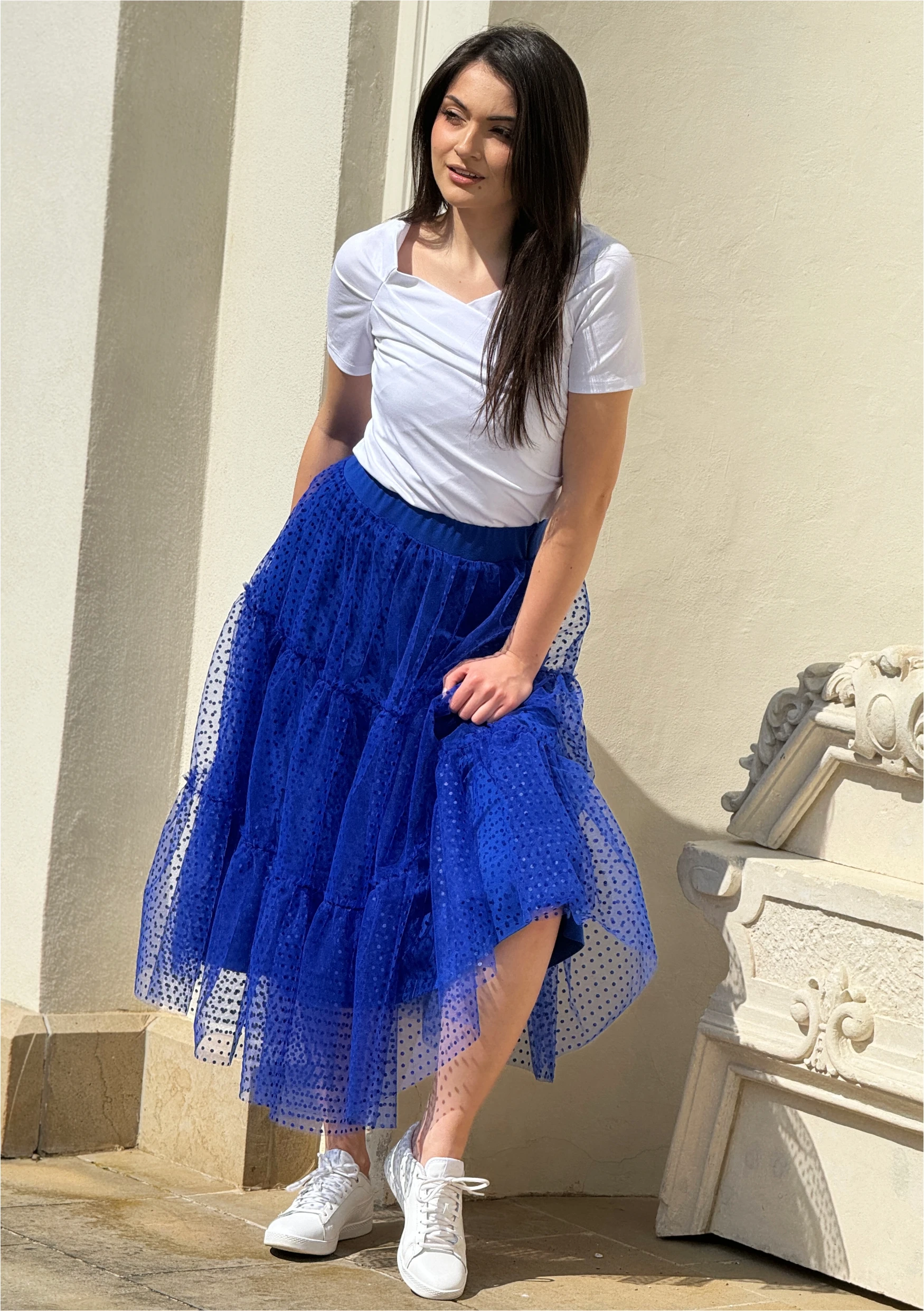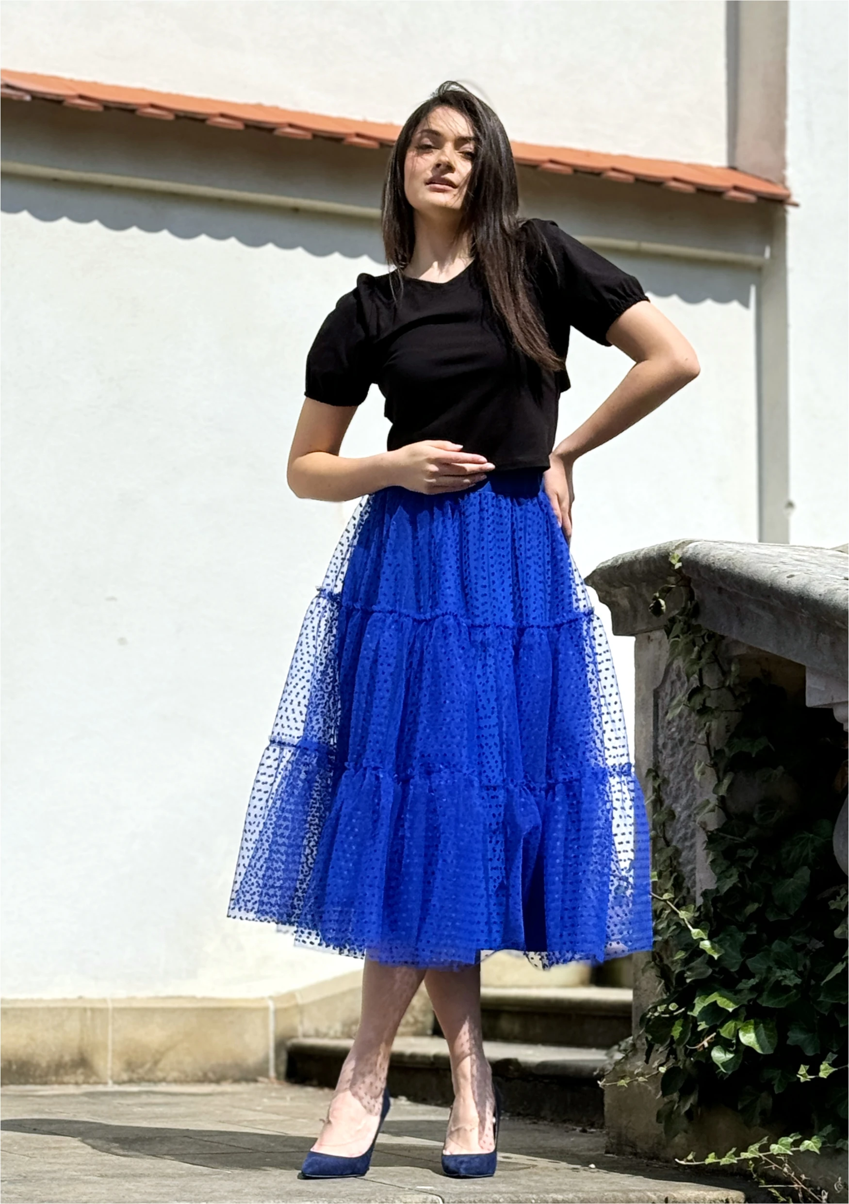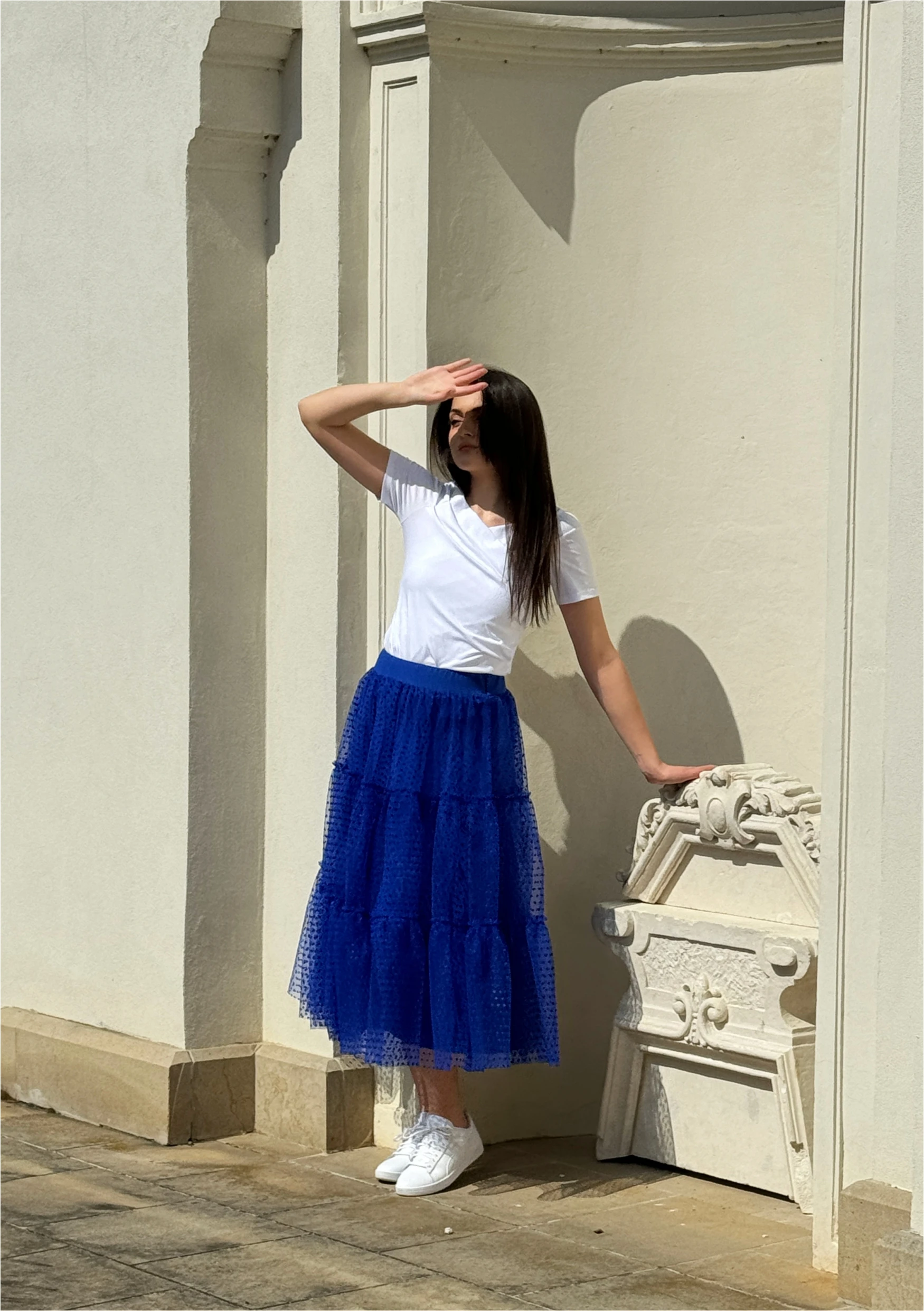 Rozkloszowana spódnica z efektowną wierzchnią warstwą miękkiego tiulu, który tworzy subtelną mgiełkę i dodaje całości elegancji. Spodnia, gładka warstwa zapewnia komfort noszenia, a elastyczny pas gwarantuje idealne dopasowanie i stabilne utrzymanie spódnicy na miejscu. Model idealny na wyjątkowe okazje, jak i do codziennych, bardziej kobiecych stylizacji.
