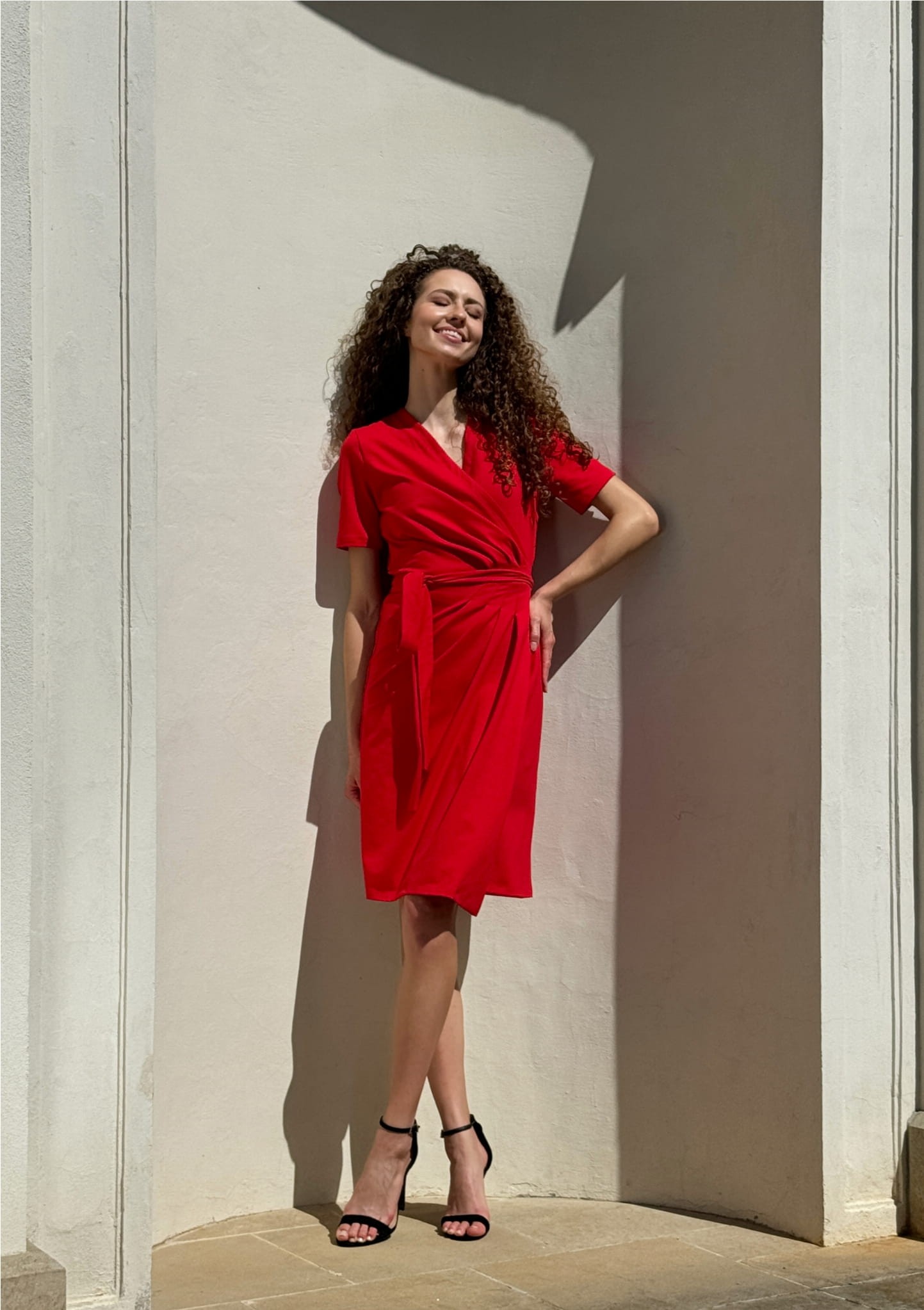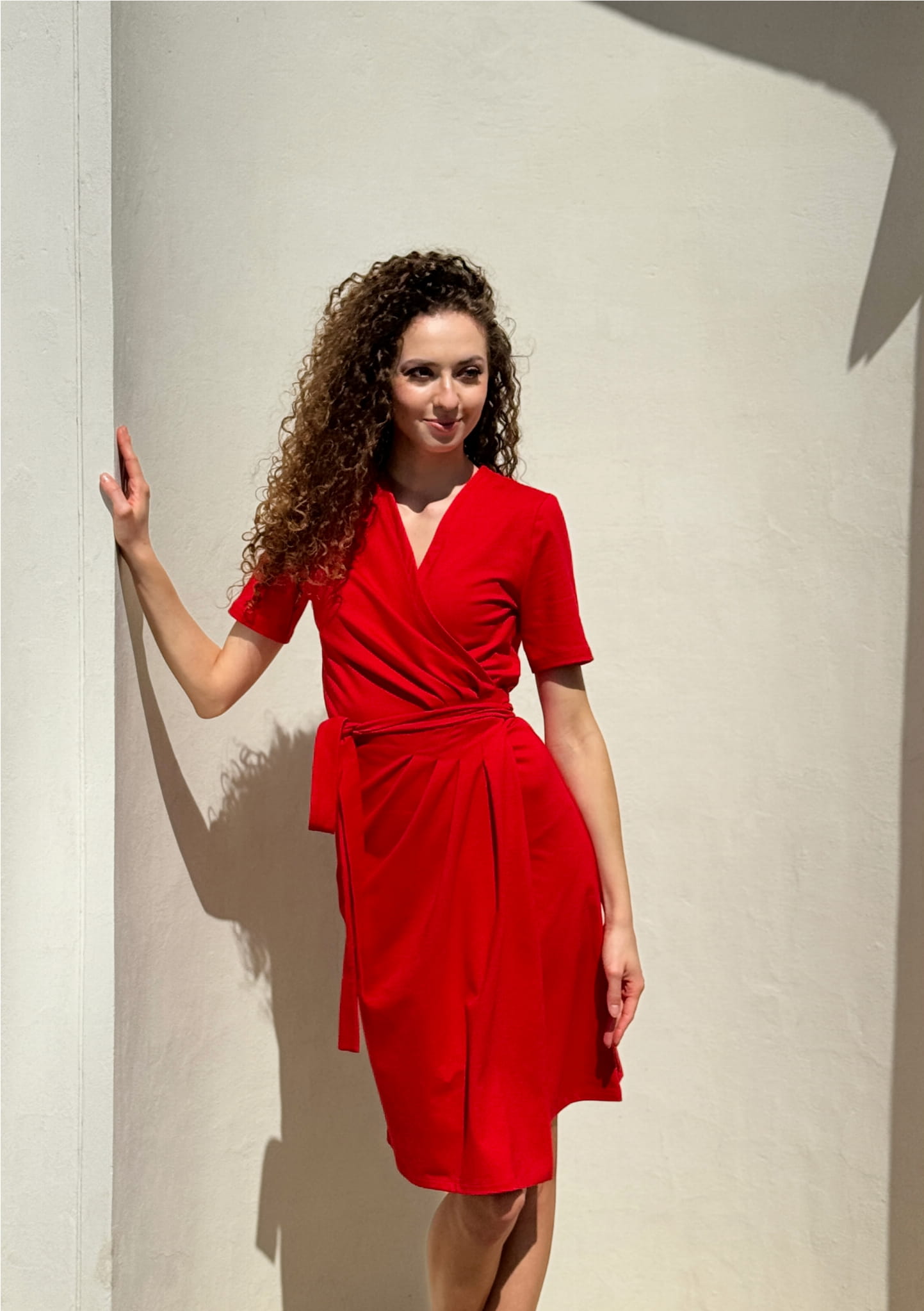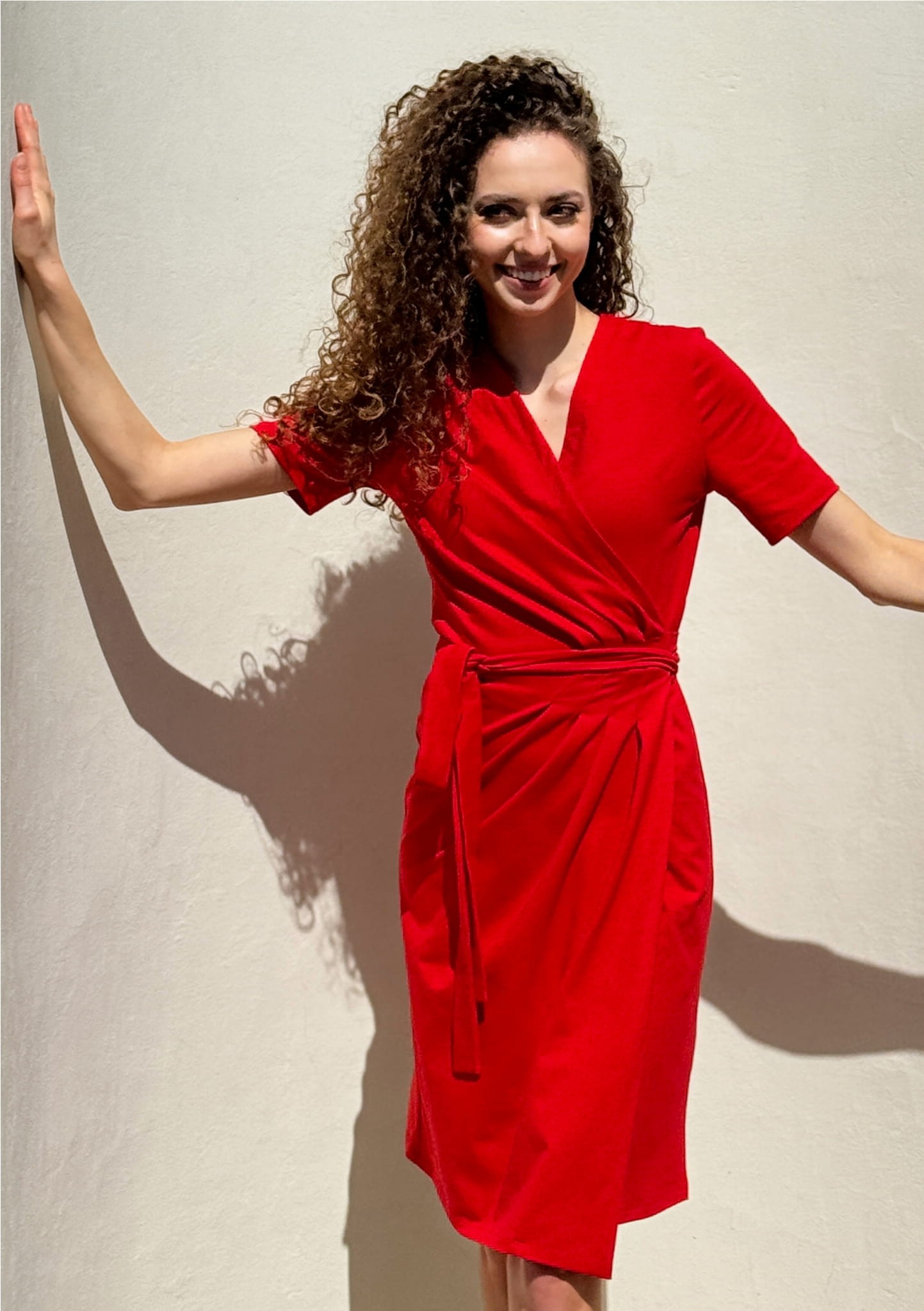 Sukienka z kopertowym dekoltem i zakładanym dołem.