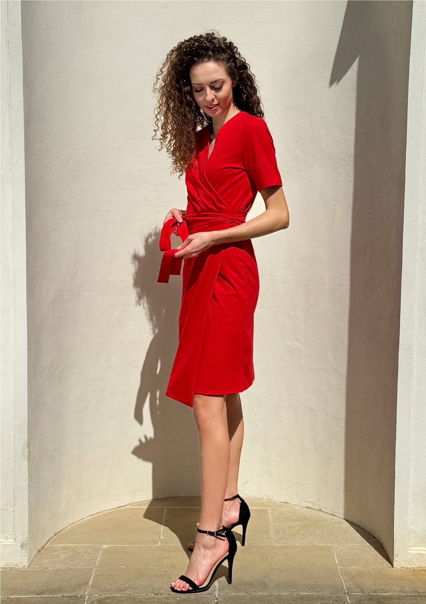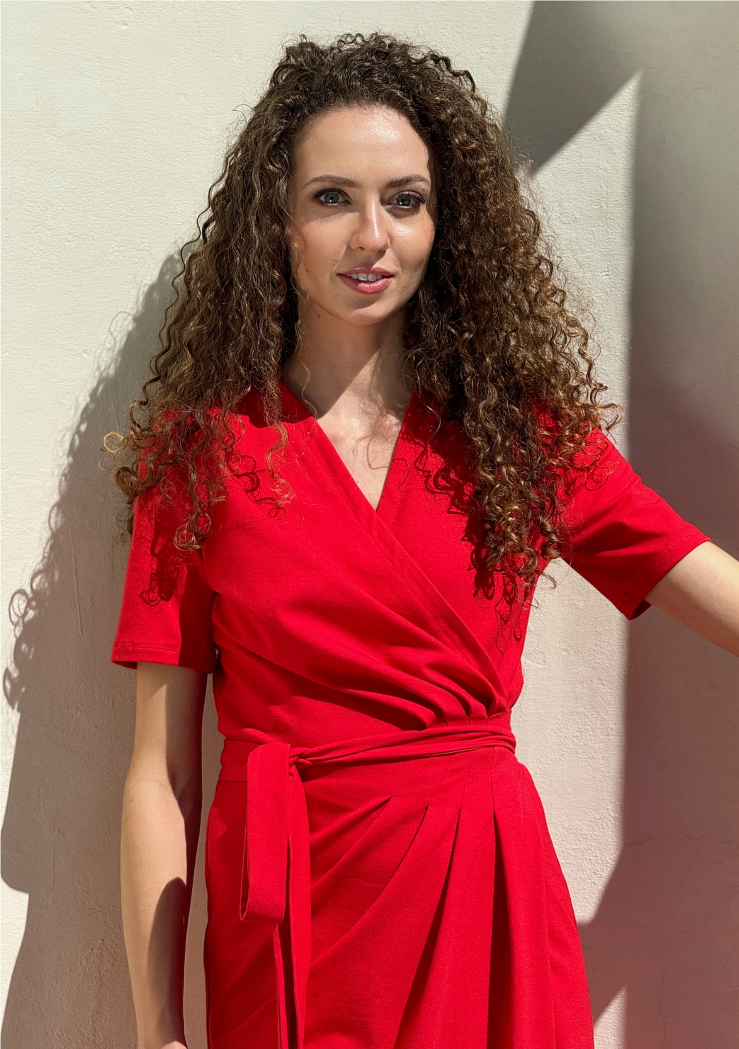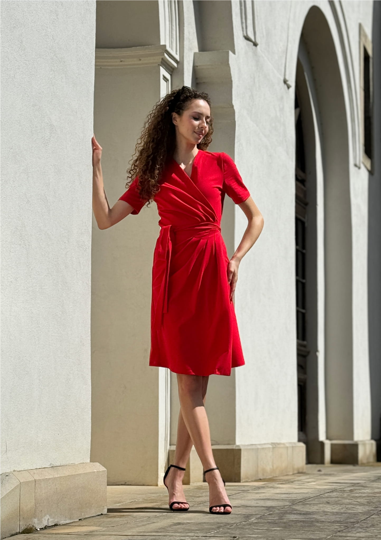 Sukienka z kopertowym dekoltem i zakładanym dołem.